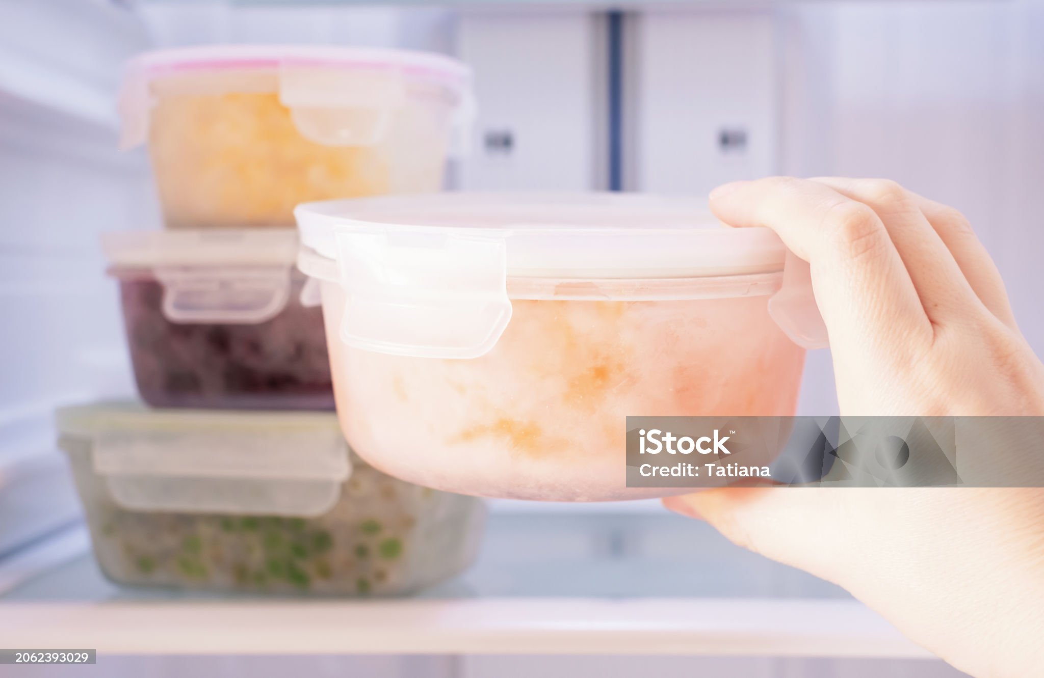 Female hand takes out a glass box with frozen carrots from the refrigerator close-up.
