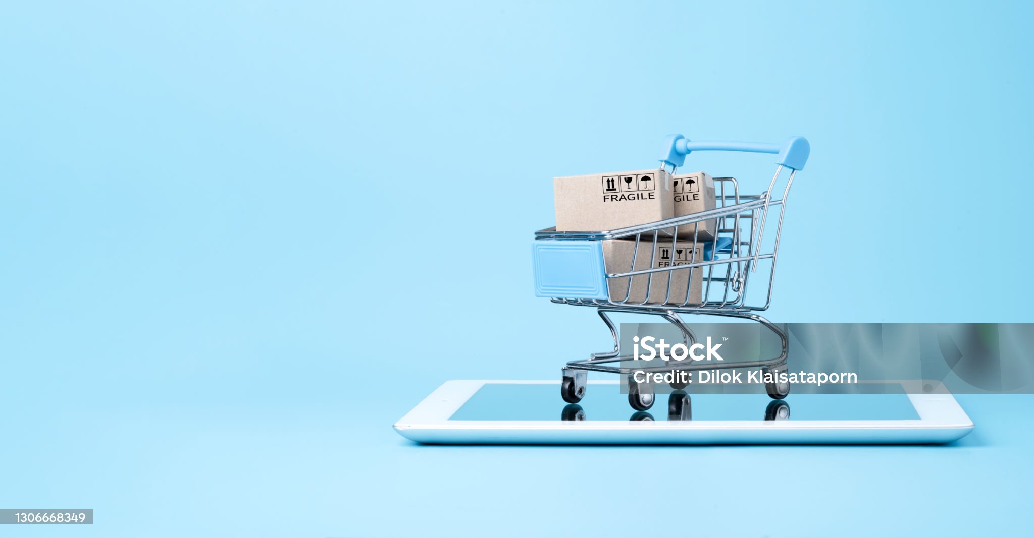 Isolated of Shipping paper boxes inside blue shopping cart trolley on tablet with blue background and copy space , Online shopping and e-commerce concept.