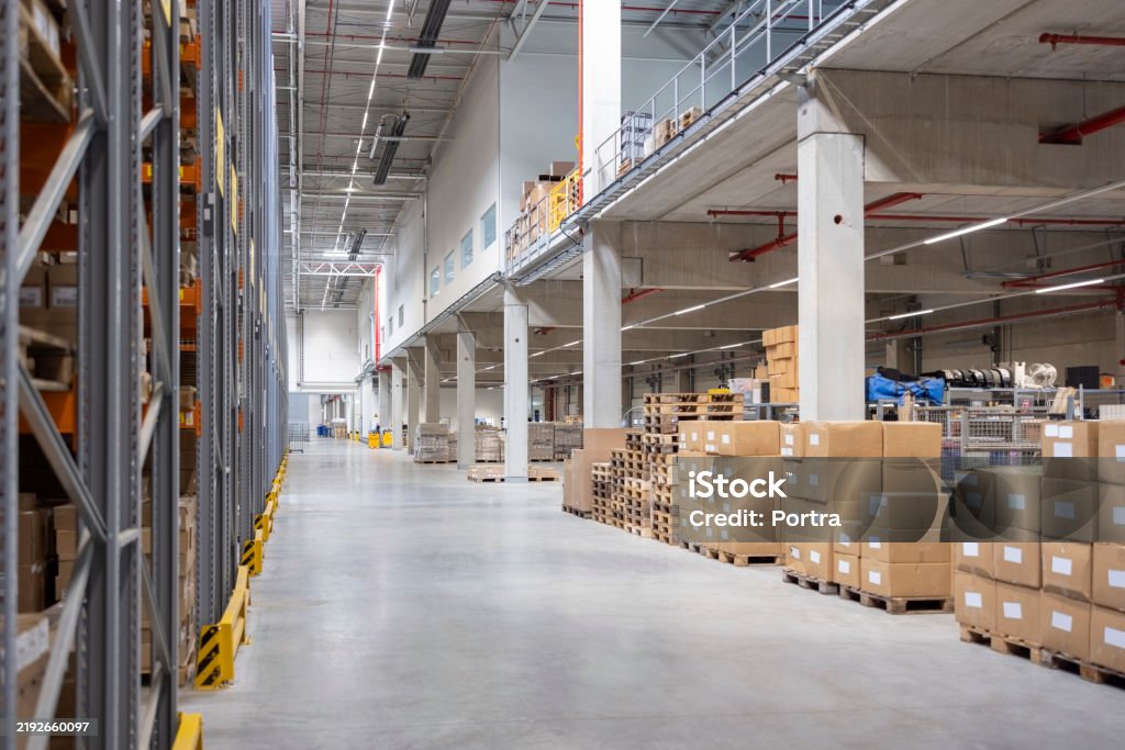 Stack of cardboard boxes and storage racks in a large warehouse. The interior of the big distribution warehouse emphasizes efficient storage solutions and organized logistics.